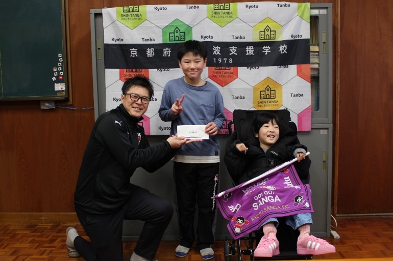 京都サンガF.C.様より、本校の児童生徒へ試合観戦チケットのプレゼント企画があり、本校から申し込みをしていた約90枚のチケットを、スタッフの林様が直接学校まで届けてくださいました。