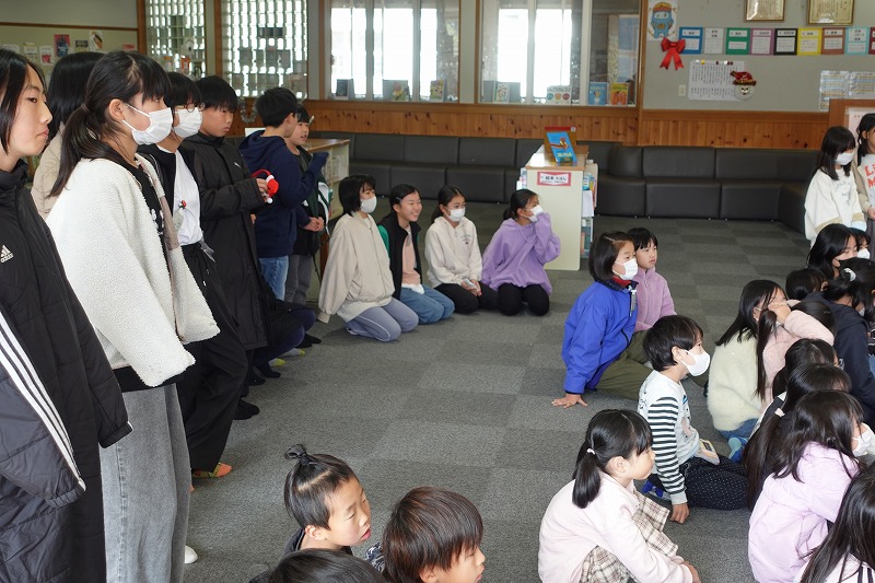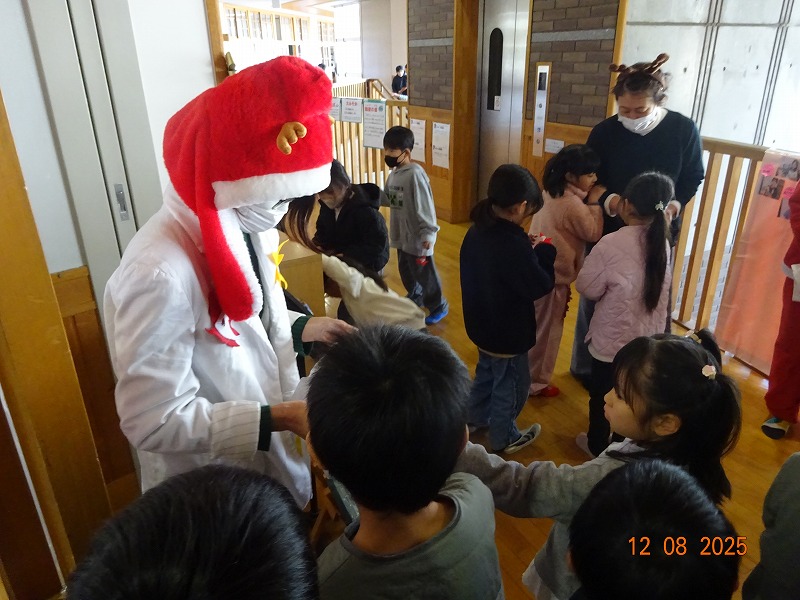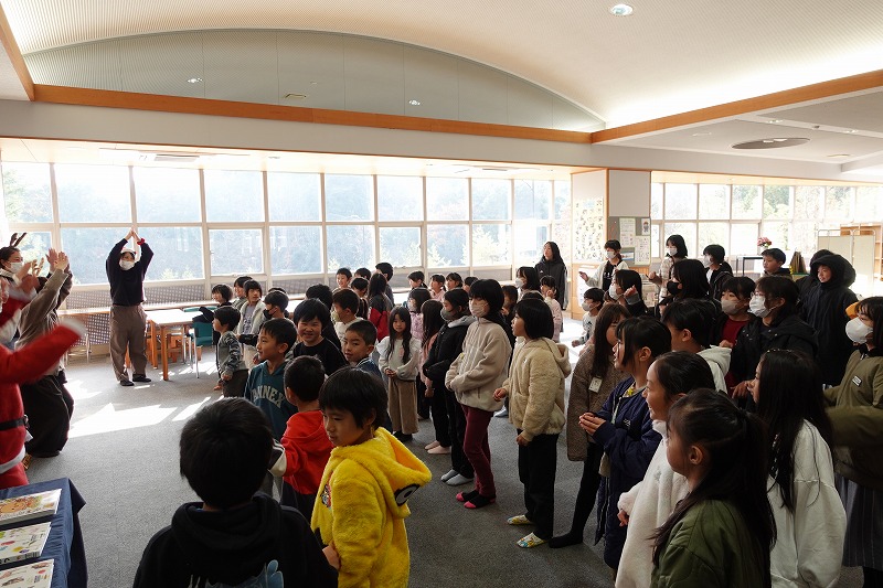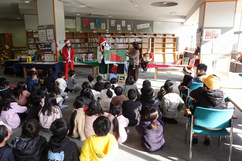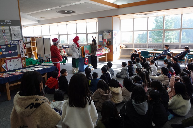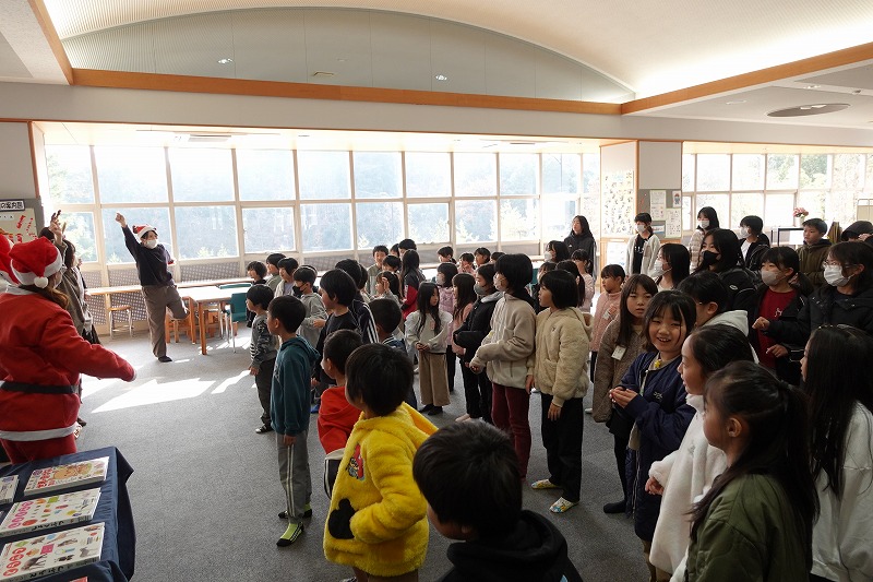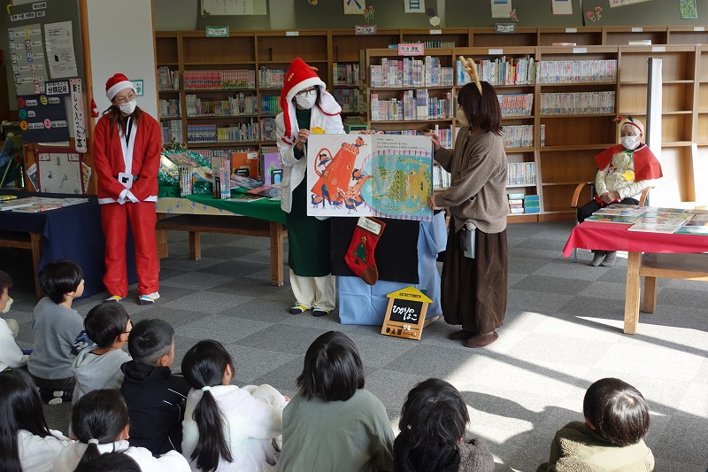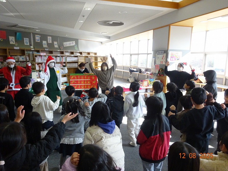 図書ボランティアさん「ひかりのはこ」さんによるおはなし会がありました。「いかたろう」の絵本に魔法をかけると、あら不思議、大型絵本に変身し、読み聞かせをしてくださいました。その後、お話に出てくるダンスをみんなで踊って、図書室が大いに盛り上がりました。最後は、サンタさんの折り紙のプレゼントをいただくなど、楽しいおはなし会の一時を過ごしました。ひかりのはこさんありがとうございました。
