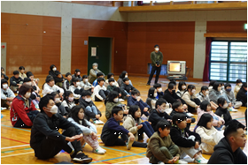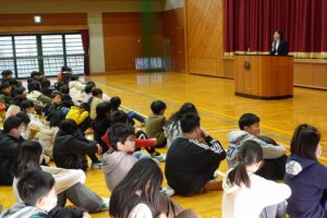 本当によく聞いてくれていたと思います。真剣に話を聞いていると、会場に一体感が出てくるので、話す側もとても話しやすくなります。「人の話を聞く」ことは、その人を大切にすることでもあります。今、どの学級においても、互いを傾聴し、考えや思いに耳を傾ける姿があります。指導者の話もしっかり聞いており、我々も子どもたちに大切にされていると感じます。相手の思いを大切にしようとしているその姿は、学びの深まりだけでなく、安心してすごせる学級・学校の土台となっていることがよくわかります。また、丹波ひかり小学校の先生方はみんなのことが大好きであること、みんなに幸せになってほしいと願っていること、けれども幸せは自分たちで創ることが大切で、そのために自分の心を見つめ問い続けることが必要であることも話しました。