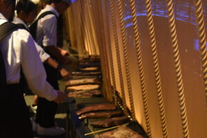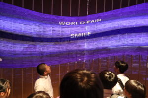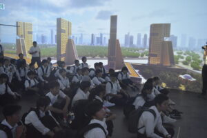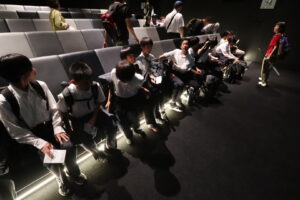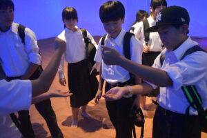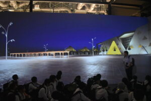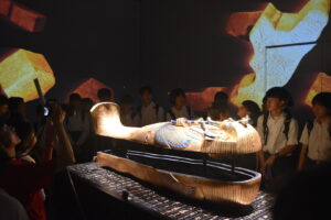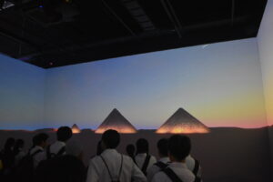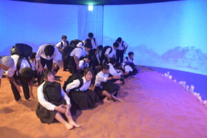パビリオンはエジプト館・三菱未来館・ヨルダン館を全員で見学しました。それぞれのパビリオンでは、各国の文化や最新技術に触れることができ、生徒たちは興味深く展示を見ていました。ヨルダン館では現地の砂漠の砂の上で、ヨルダンの伝統や自然に関する映像に見入りました。