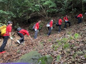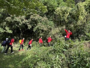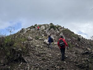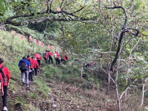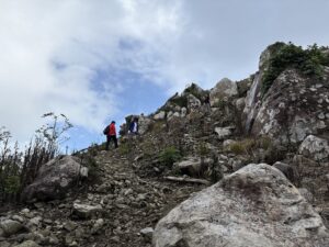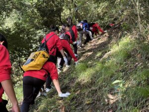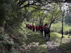 当日はさわやかな秋晴れの中登山をスタートしましたが、途中の急斜面では足元がすべる場所も何か所もあり、手をつきながら、お互い励まし合いながら全員が無事に登頂することができました。