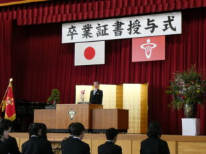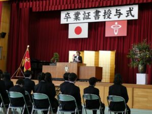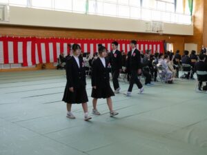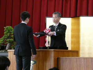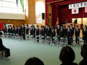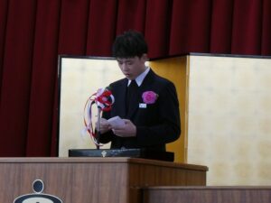 在校生代表大西湊人さんの送辞では、「行事や部活動でリーダーシップを発揮した3年生の姿は、今後の自分たちの目標です」と、先輩への憧れと感謝が伝え、卒業生代表野口優生さんの答辞では、共に歩んだ仲間、在校生、教職員、そして家族への深い感謝とともに、未来への希望を力強く語りました。