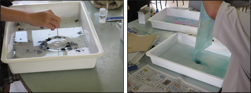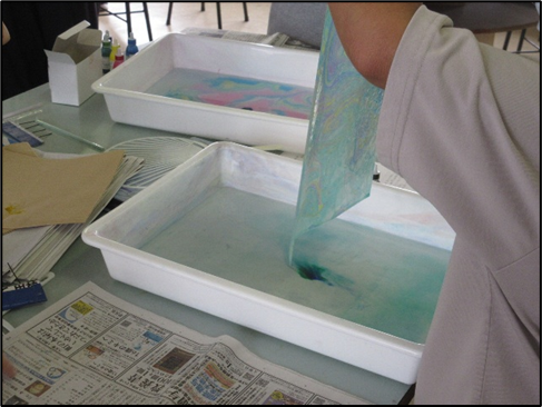 〇 マーブル染めでは、似たような色でも全く違う柄ができてきれいだった。水に色をつ けるのが楽しかったが、半紙に色をうつす作業やのり付けは難しかった。