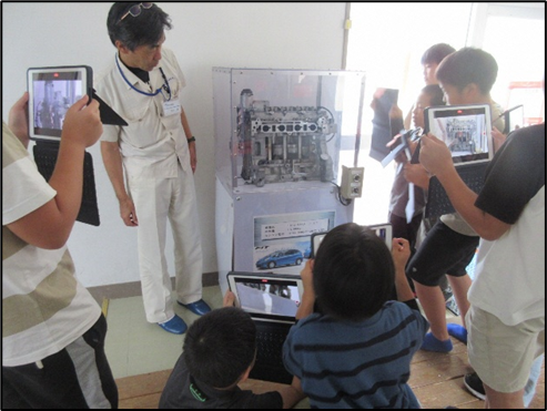 その後、自動車エンジンの模型を実際に見学し、エンジンが動いている様子を見ながら「この部品はどんな意味があるの?」「このボタンは何のためにあるの?」「あの赤く点滅しているのは何?」「このエンジン(模型)はどうやって持ってきたの?」など、チャイムが鳴り終わった後も質問を続けるなど、子どもたちの興味・関心は尽きませんでした。
