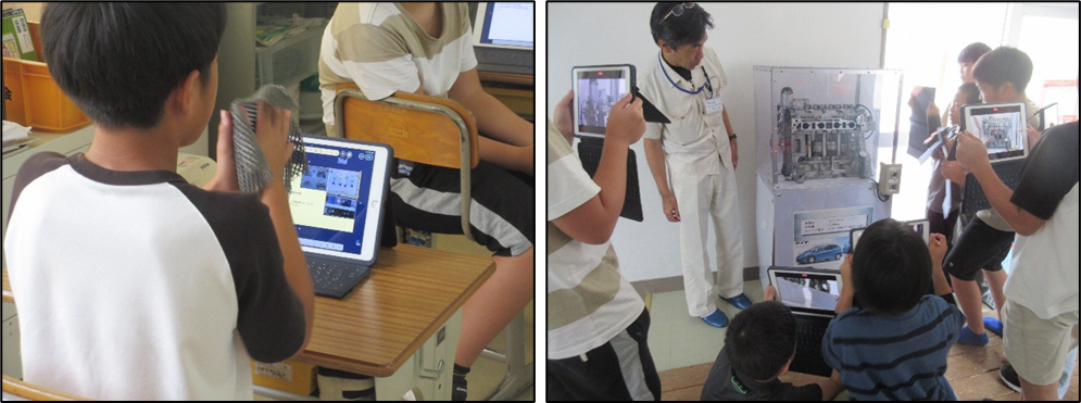 今回の出前講座は、株式会社日進PREVOによる「知ってみよう 自動車・オートバイ等の部品製作の世界」です。前半は、講師の小川課長から、日進PREVO(旧タンゴ技研)の歴史や、部品を製造している自動車製造工場の動画などを活用しながら、金属部品製作について講義がありました。講義の途中には、工場のある峰山地域や三河内小学校の地域に係る問題も出題されました。子どもたちはメモを取ったりタブレットで写真を撮ったりしながら、積極的に問題に答えるなど、主体的に講座を楽しんでいました。また、「機械(ロボット)には機械の得意分野がある一方で、人の力でないとできない作業工程もある」と聞いて、大きくうなずく様子も見られました。さらに、沖田アドバイザーから「ロケットに使われる、数千度の熱に耐えられる部品も製造している」という話を聞いて、子どもたちは、驚きの声を上げていました。