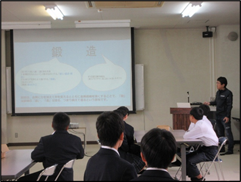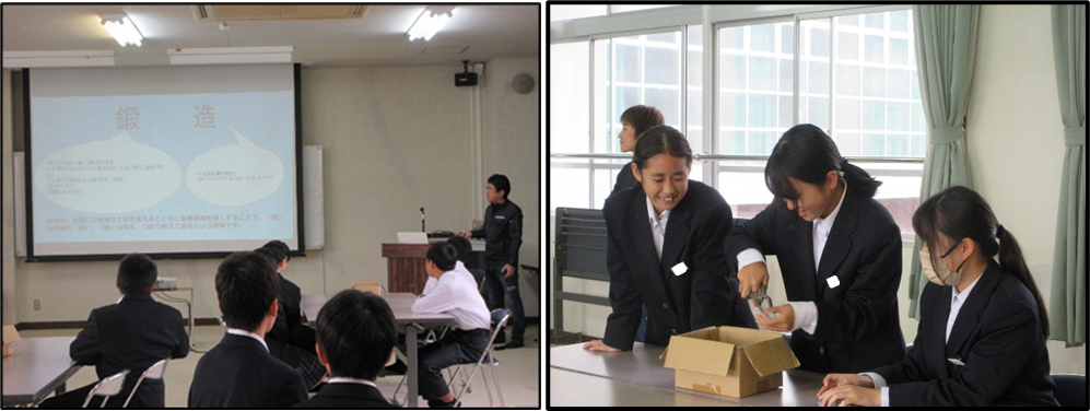 今回の出前講座は、株式会社韋城製作所による「“叩けば強くなる”鍛造の世界」です。山本社長自身が講師となり、動画などを活用し、鍛造の技術について非常にわかりやすい講義がありました。講義の中では、生徒の意欲を引き出すような親近感のある声かけや、鍛造の原点である刀鍛冶に関する動画などが活用されており、生徒たちは最後まで関心をもって講義に臨んでいました。後半は、超高温の金属を取り扱う際に使用する工具“やっとこ”を使って、様々なものを掴んで移動させる体験も行われました。生徒たちは「プロ」のスピードと正確さを目の当たりにして、どうすれば掴みやすいか?どうすれば取り出しやすいか?などグループ内で対話をしながら創意工夫する姿も見られました。生徒たちは体験を通じて、鍛造をはじめとした丹後の製造業に関心をもつとともに、それを支える「職人」たちの技術力の高さを、身をもって実感していました。
