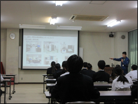 今回の出前講座は、京都府織物・機械金属振興センターによる「丹後の機械金属業の世界を知ってみよう」です。技術連携課の早川様による京都府織物・機械金属振興センターの設置目的や、工業・機械金属業とは何かという講義から始まりました。金属を加工する様々な機械についての動画を交えた解説の後、丹後の実情、世界とのつながり、外国人就労者についてなど、非常に多岐にわたりました。最後は、「20年後の丹後を考える」として、いかに、丹後における技術者の育成を進めるかという課題を、未来を担う中学生へ提起する形で講義を終えました。生徒たちにとって、丹後の工場が、宇宙開発に関わっていることや、戦時中の工場疎開が丹後に機械金属工業が定着する契機となったという歴史的な背景は、新鮮な発見のようでした。今回の講座を通じて、生徒たちは、丹後には機械金属産業という誇るべき産業があり、先人たちが培ってきた歴史がある事を知るとともに、丹後の未来について、真剣に考えていました。
