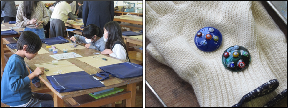 まず、子どもたちは、講師である塩野先生から光の特性やガラスの構造についての講義を受けました。その後グループに分かれて、講師や大学院生らのサポートを受けながら、七宝焼きづくりに取り組みました。ベースとなる釉薬の色やミルフィリオ(模様入りのガラス玉)の配置など、子どもたちの自由な発想をもとに作業に取り組んでいました。そして、電気炉から取り出された「世界で一つだけの七宝焼き」を手にした瞬間、どの子からも自然と笑顔がこぼれていました。