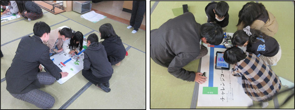 各グループに高校生がついて講座を進めていきました。高校生が寄り添いながら丁寧な声掛けをすることで、児童らはミッションの難易度が上がってもあきらめることなく、最後まで主体的に取り組む姿が見られました。「ゴールできちんと止まるには?」「直角コーナーをうまく曲がるには?」など、ミッションクリアのためにロボットにどのようなプログラミングをするか、グループ内で意見を出し合いながら、時間を忘れて思考を働かせていました。そして、今回の講座を通じて自分たちが入力したプログラムがロボットの動きと連動していることを実体験しました。