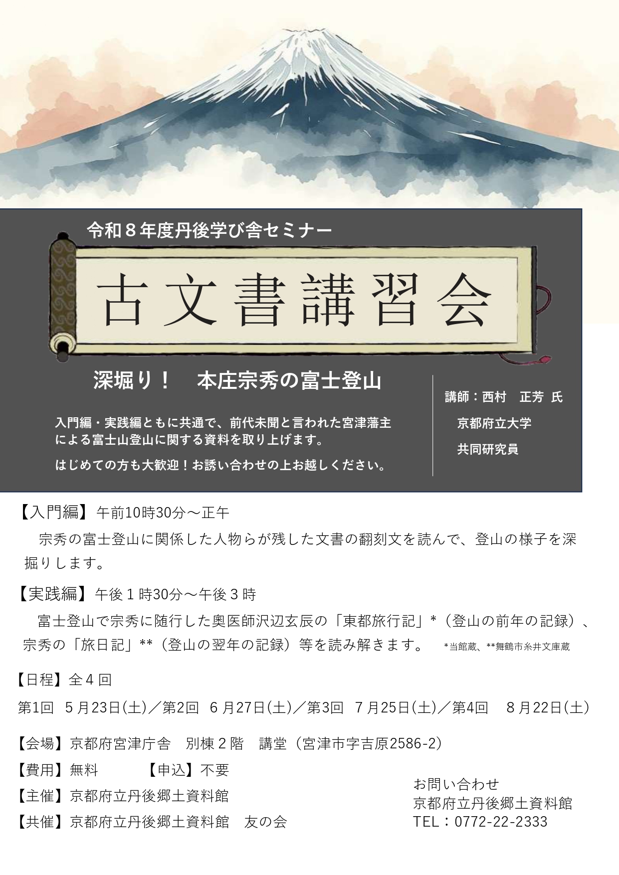 令和8年度古文書講習会のお知らせ お知らせ・トピックス Twitter Facebook はてブ Pocket LINE コピー 2026.04.09 令和8年度に実施する古文書講習会のお知らせを掲載しました。詳しくはこちらのページをご覧ください。 Post Views: 7