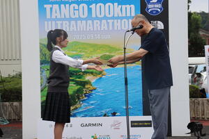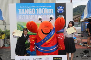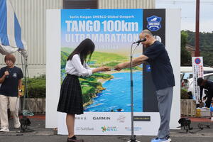 9月13日(土)、山陰海岸ユネスコ世界ジオパーク第23回丹後100kmウルトラマラソンのTシャツデザイン表彰式が行われました。今年度も本校企画経営科の生徒が応募し、3年連続で最優秀賞を受賞しました。そして、今年度のTシャツのデザインとなりました。また、優秀賞にも2名選出され、京丹後市長様より表彰していただきました。