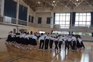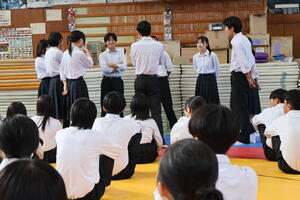 9月17日(水)の6時間目、24日の体育祭を前に各連合に分かれて連合集会を行いました。この連合制は、学年を赤・白・青の3つに縦割したもので、体育祭当日はそれぞれ分かれて競技を競い合うものです。 この日は各連合のメンバーがそれぞれ初めて集う場となりました。はじめに連合長が自己紹介をし、優勝への決意を述べました。続いて、一部競技の確認をした後、最後に各連合が力強く掛け声をあげて士気を高め合いました。