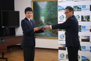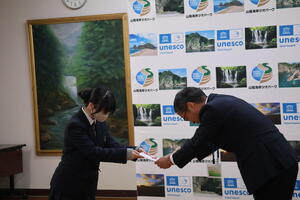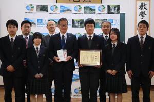 12月10日(水)、山陰海岸ジオパーク推進協議会様から企画経営科に対して感謝状が授与されました。今夏の恐丹後お化け屋敷は、山陰海岸ジオパークをテーマに企画をし実施しました。そして、そこで売り上げた純利益を、山陰海岸ジオパーク様に全額寄付をしたところ、この度、事務局長の大江信一郎様より本校企画経営科に対して感謝状を頂きました。これからも丹後緑風高校企画経営科は、地元地域の活性化のために様々な取組を企画し、実践してまいります。