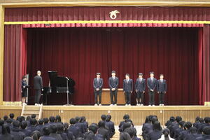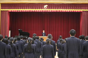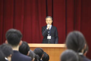 校長はこの話を通して、どん底があったからこそ新しい挑戦と勝利のドラマが生まれたということ、仲間や集団の力の大切さ、そして細部にまでこだわりさらに良いものを追究しようと挑戦することの大切さを学ぶことができる、と話しました。そして、全校生徒に対し、この一年を挑戦と達成の年にしていこうと呼びかけました。