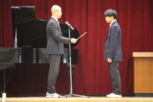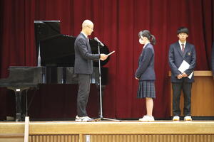 続いて、伝達表彰と壮行会がありました。レスリング部とスキー同好会のメンバーが紹介され、全校生徒から大きな拍手が送られていました。