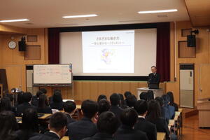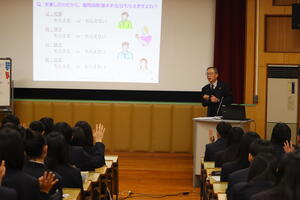2月18日(水)の5時間目、3年生が社会保険や労働保険などの種類やしくみについて学びました。 特定社会保険労務士・年金アドバイザーの辻賢二 様を講師にお招きし、社会保険や労働保険、年金の種類について講義を受けました。さらに、働き方の多様化に伴って、それぞれの職業に適用されるこれらの種類や制度が異なることを、具体的な事例を通して話していただきました。 3年生の皆さん。これらのしくみを押さえ、将来 自分自身が働く際に"適切な手続き"をしっかりと行いましょう。