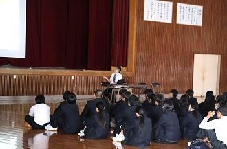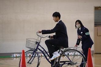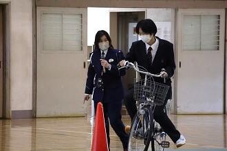 はじめに京都府安心・安全まちづくり推進課の方による自転車安全利用推進員講習がありました。その後、京丹後警察署交通課の方を講師に、生徒の実演を交えながら自転車のルールやマナーについて講演をしていただきました。