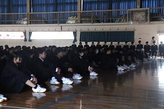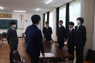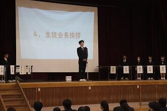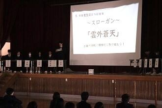 続いて今年度の議題に移り、生徒会スローガン"雲外蒼天(うんがいそうてん)"が発表されました。どんな試練や苦難があっても努力して乗り越えれば、その先には晴れやかな素晴らしい未来が待っているという意味です。このスローガンの下、様々な取組に積極的に挑戦し、自分自身の目標や進路を達成させていきましょうと、全校生徒に呼びかけました。