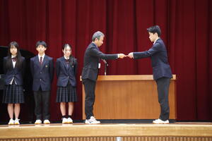 続いて、新生徒会執行部による伝達表彰が行われました。レスリング部、陸上競技部、企画経営科の生徒が登壇し、それぞれ校長から表彰を受けました。