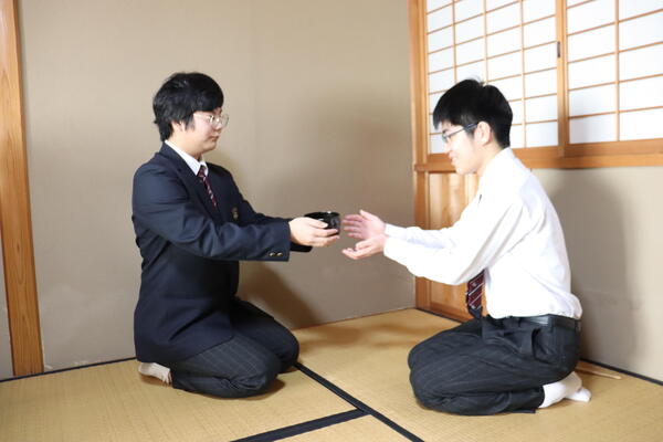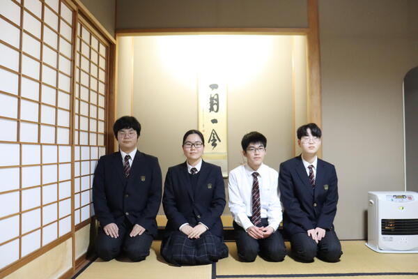 1月7日(水)、新年初めてのお稽古を行いました。稽古初めの日に懐石料理から濃茶・薄茶へと続く特別な茶事を体験しました。今年度の目標を一言発表し、おめでたい雰囲気の中で茶の湯を楽しみました。