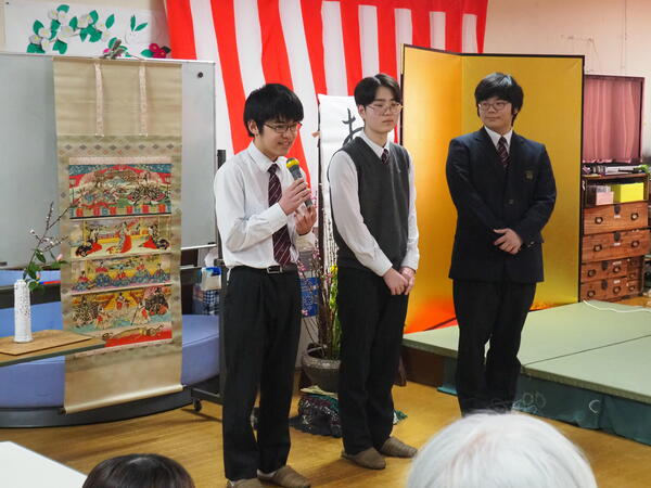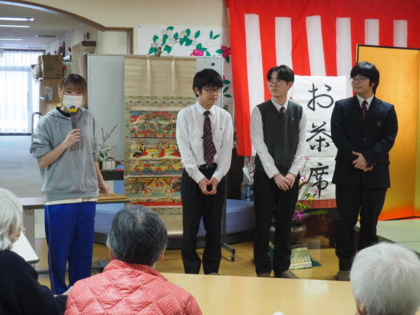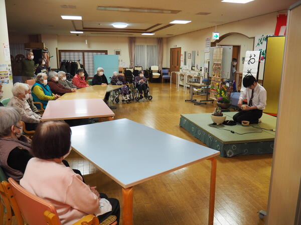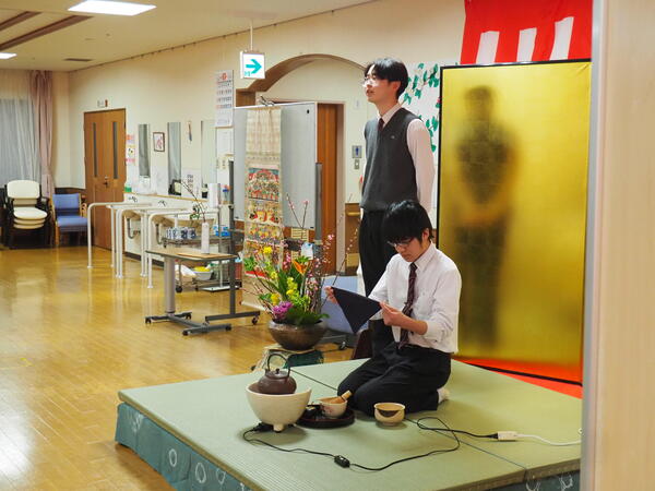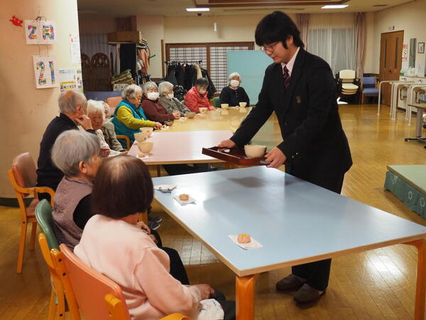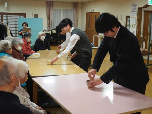 2月21日(土)、久美浜学舎を卒業した茶道部員のお誘いをうけ、おおみや苑で呈茶を行いました。デイサービスを利用される方に1年生の茶道部員は覚えたての盆略点前を見ていただきました。呈茶の後に利用者さんとの交流があり、実際にお茶を点てるところを間近で見てもらいました。その後に生徒の自己紹介やおおみや苑の利用者さんへの質疑応答の時間がありました。生徒からは「長生きの秘訣は何ですか?」と質問が出たり、「進路が決まっていないのですがどうしたらいいですか?」など人生の先輩へ教えを乞う姿がみられ、とても和やかで優しい時間の流れるボランティア呈茶となりました。