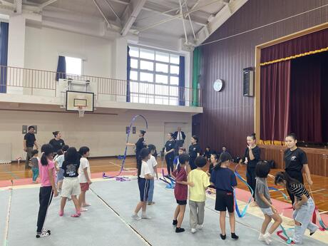 10月18日(土)に弥栄小学校で演技披露がありました。男女で個人演技や集団演技を披露しました。体操体験の時間では男女の手具(リボンやフープ、スティックなど)に触れてみたり、AMIKO体操を一緒に行ったりと弥栄小の皆さんに喜んでもらえたと思います。