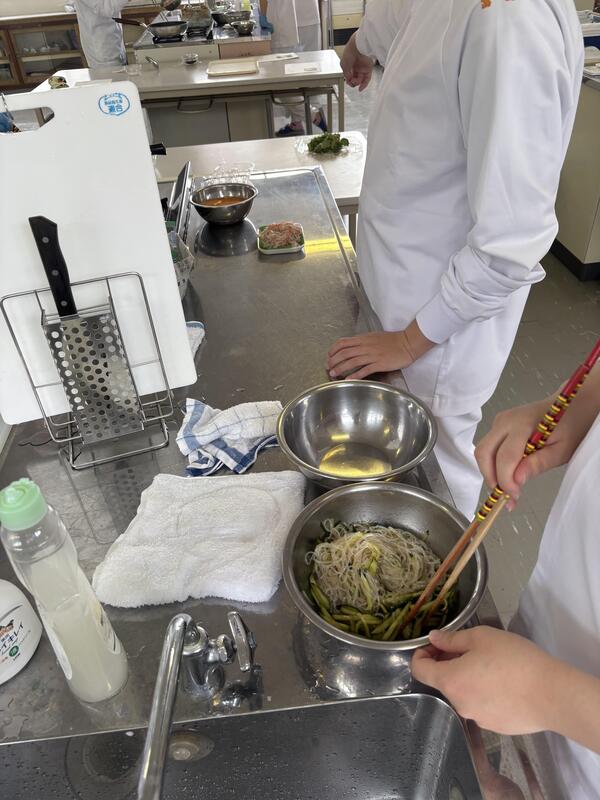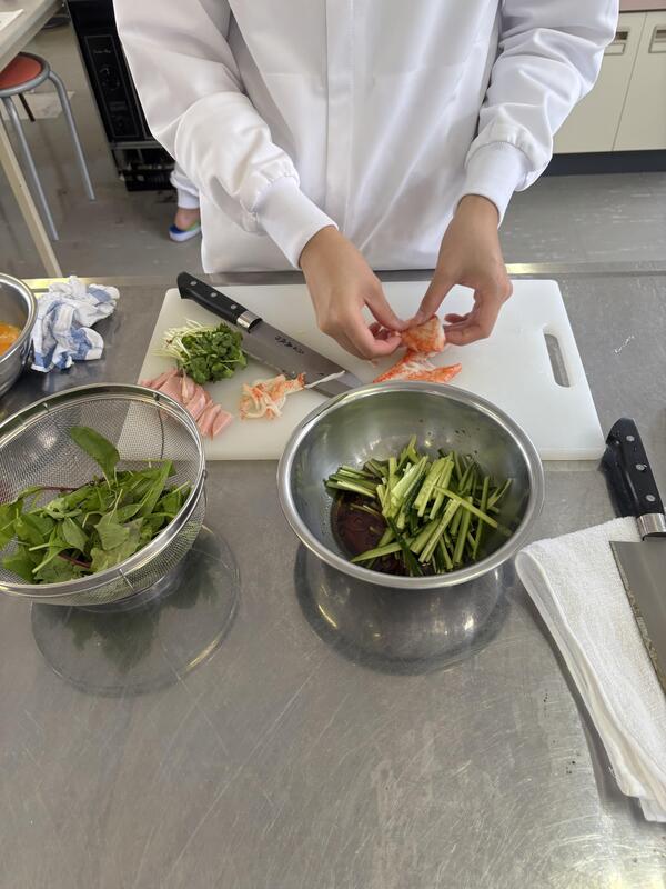 10月14日(火)わくわくKitchen1回目をおこないました。今回のメニューは一人暮らしでも簡単にできる親子丼と春雨サラダの二品を教えて頂きました。かつお昆布だしを作り、鶏肉を一口サイズに切り下味をつけて、親子丼を作りました。春雨サラダは野菜たっぷり、栄養バランスに富んだ物が出来上がり、生徒はとても満足して一人暮らしをしても大丈夫と喜んで試食していました。次回の1月には自分で考えたメニューで料理する予定です。