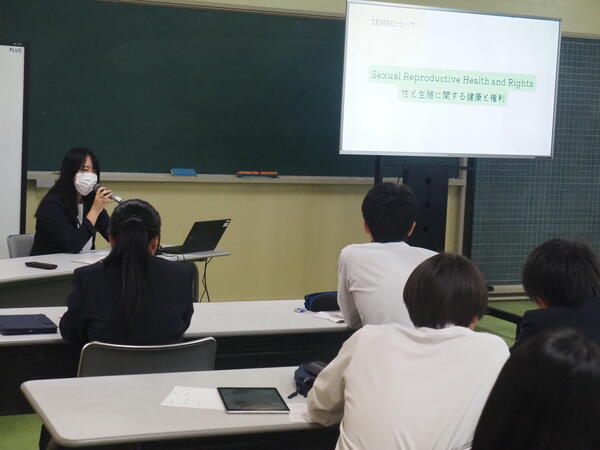 10月15日(水)5時間目に、ゆう薬局の薬剤師の吉松友里様を講師にお迎えし、2年生対象に性教育講演会を行いました。「自分と向き合う性の話」をテーマに講演をしていただきました。自分たちの体と心について正しく理解し、早くから健康的な生活習慣を身に付けることが将来のすこやかな妊娠・出産にもつながっていくという考え方の「プレコンセプションケア」について話していただきました。生徒たちは熱心に耳を傾けていました。