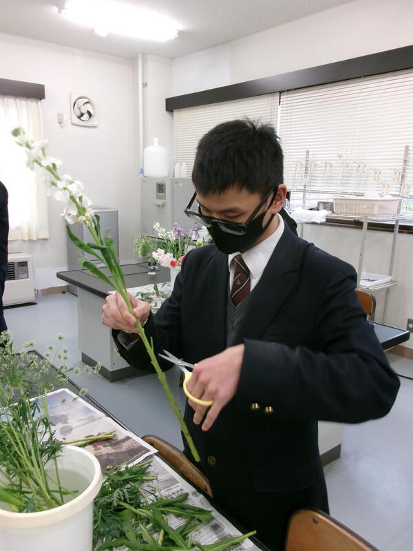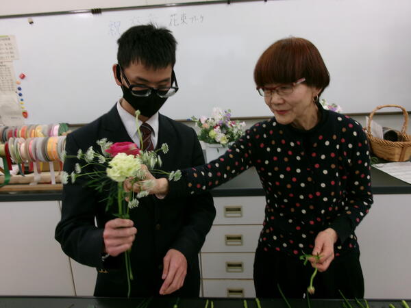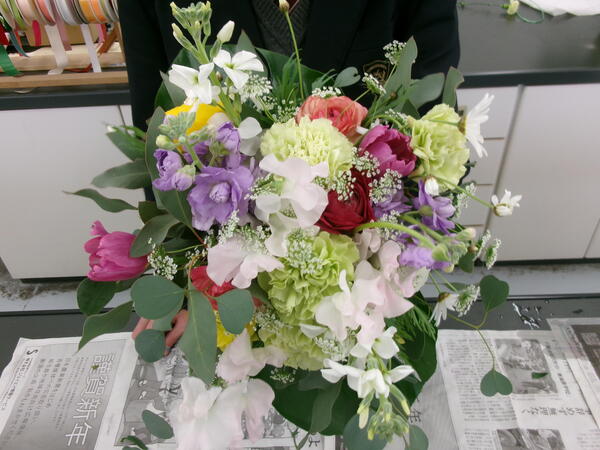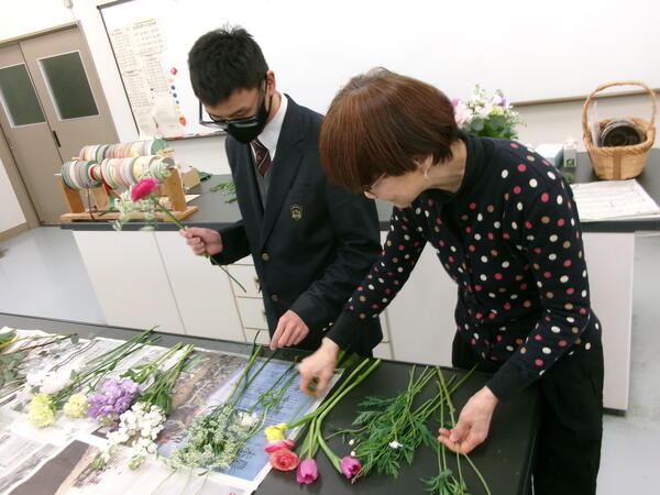 1月14日(水)に「フローラルアート」の授業で、フラワーアレンジメント講習会の第3回目(本年度最終回)を開催しました。外部講師に「花かたにし」片西幸代様をお招きし、ラナンキュラスやストック、チューリップ、スイートピー、カーネーションなどを使用した花束の制作を教えていただきました。生徒は、1年間のまとめとして卒業制作に相応しい豪華な花束を完成させました。教員から「バランスよく仕上がっている」と褒められ、生徒自身も「上手にできた」と喜んでいました。
