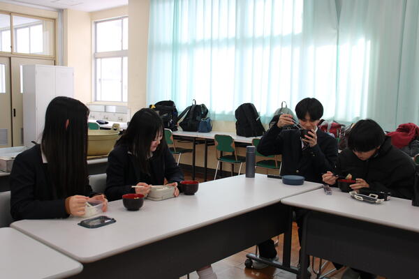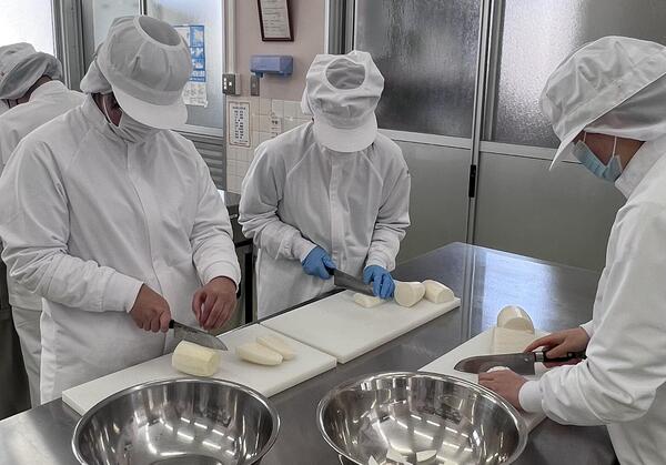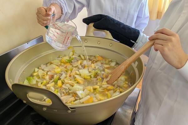 2年生の生産コースが炊飯し、食品コースがそれぞれの材料を使った豚汁を作りました。