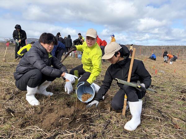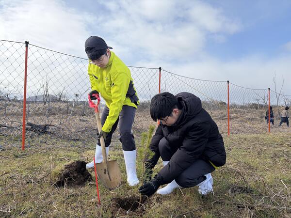 3月14日(土)に久美浜町箱石浜の松苗植栽ボランティアに14名の生徒が参加しました。始まる前は小雨が降るような天候でしたが、活動時には雨も止み、200本の苗を植えつけました。