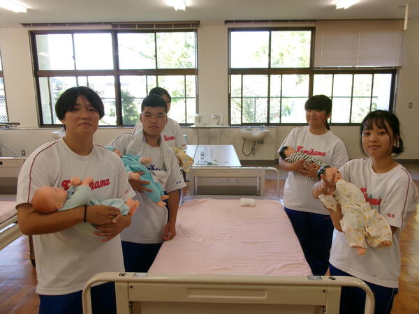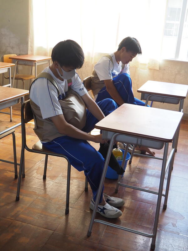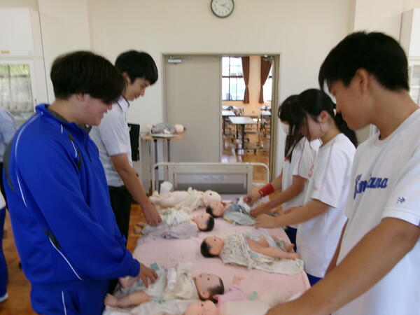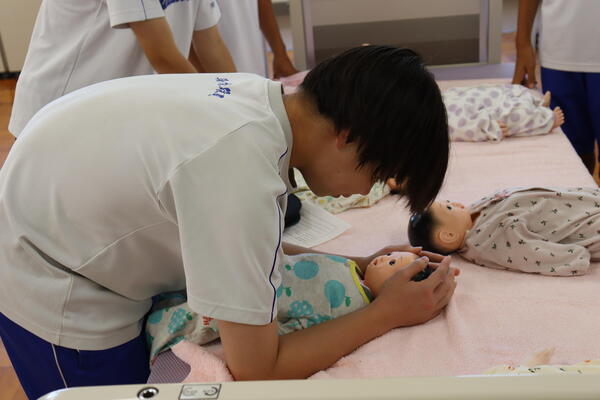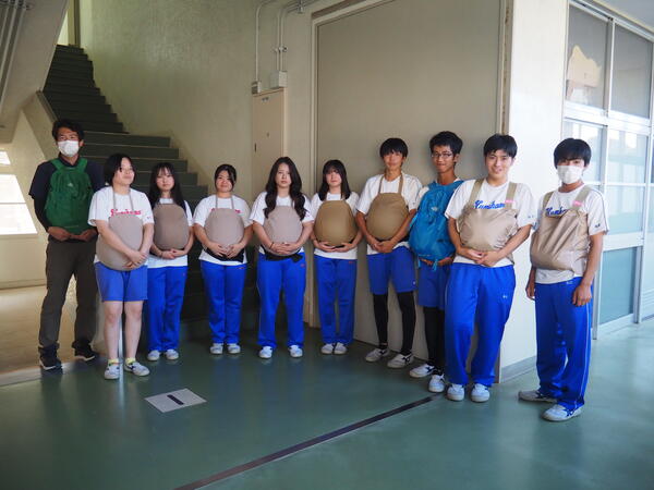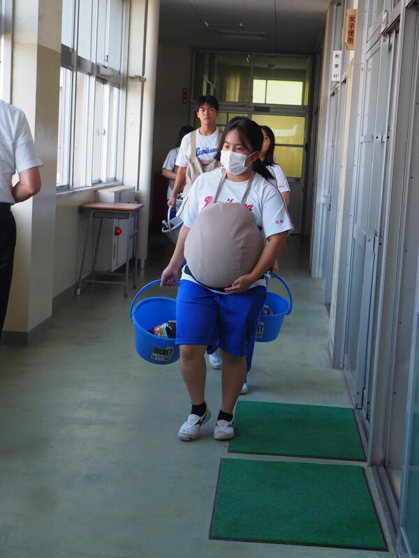10月1日(水)、妊婦体験を実施しました。8.5kgの妊婦ジャケットを着用し、階段の昇降、靴下の着脱、かがんでの作業を体験し、妊婦さんの気持ちを考えました。また、3kgの赤ちゃん人形を抱っこしたり、ミルク作りでは適温に調整したり日常的な育児に触れました。そして今年度は、男性目線の子育てについて質問や相談をする機会をもうけ、子育て経験のある男性教員が答えました。短い時間の体験にもかかわらず、お腹がつかえてしんどかった、重たかったなどの感想が多く、こんなに大変な思いをして生んでくれた両親へ感謝する様子がうかがえました。