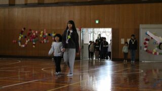 まず6年生が、1年生と手をつなぎ笑顔で入場しました。入場時には、3年生が6年生一人一人の好きな物や小学校生活の思い出、6年生への感謝の言葉を伝えました。
