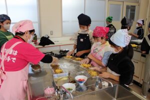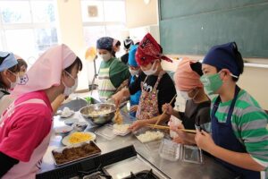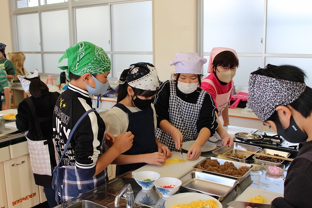 5年生児童が、自分たちで田植え・稲刈りをして収穫したお米を使って「丹後ばら寿司」を作りました。食生活改善推進員の皆様に丁寧に教えて頂き、彩り豊かに仕上がりました。お米もおいしく、子ども達から「おいしい!」という声がたくさん聞かれました。自分たちで郷土料理「丹後ばら寿司」を作る貴重な経験をさせていただき嬉しく思います。お米作りでお世話になった今井さん、食生活改善推進員の皆さん、本当にありがとうございました。