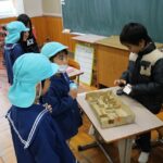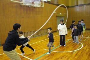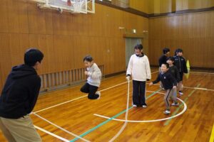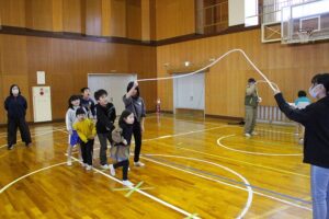 1月28日(水)の大縄大会に向けた練習が始まっています。6年生が下級生に8の字とびを教えます。苦手な人には、みんなで「1・2・3・ジャンプ」「はい!はい!」と声をかけたり、6年生が優しく背中を押してタイミングを教えたりする姿が見られます。これからも、みんなで力を合わせて練習を続け、どんどん上達していきましょう!