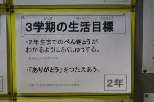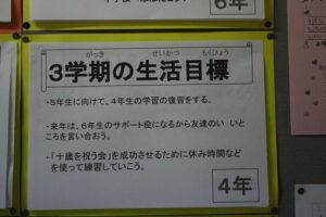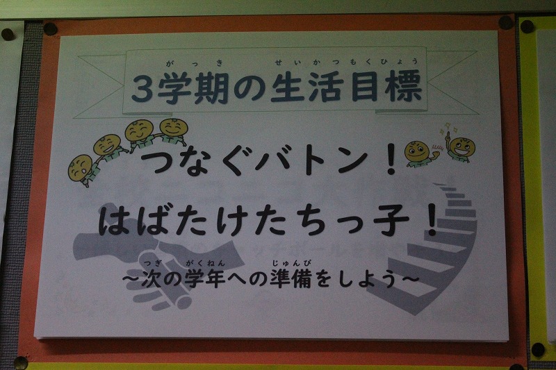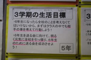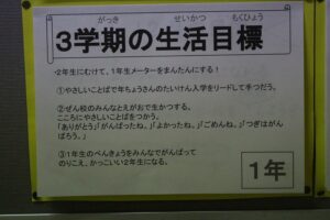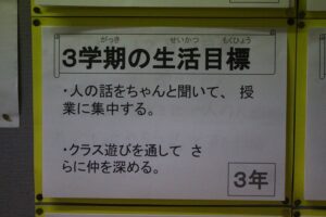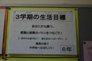 学校の様子3学期の授業日も、いよいよ残り30日あまりとなりました。児童会本部から提案された生活目標を受けて、次の学年へのステップアップを目指して、そして6年生は中学校へ向けて、各学級で話し合い、具体的な目標を決めました。1日1日を大切に過ごし、大きく成長できる3学期にしましょう!