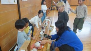 1年生は、前半は国語で学習した「くじらぐも」の音読・歌唱劇。そして後半は、生活科で作った秋のものを使ってお店ごっこをしました。