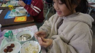 先月みんなで皮むきをし、「ひる」作業も体験した古老柿づくり。その後も、森田木一さんにお世話を続けてもらっていましたが、1ヶ月が経ってようやく食べ頃を迎えました。今日の給食時間に、森田さんを教室にお招きし、3年生ができあがった古老柿をいただ...