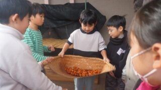 今月17日に、3年生のみんなで皮をむいて干し台に並べていた「古老柿」が、順調に乾いてきています。昨日の5時間目には、地域の古老柿づくり名人、森田木一さんに教えてもらいながら、箕(み)を使って柿を転がす、「ひる」という作業を体験しました。ま...