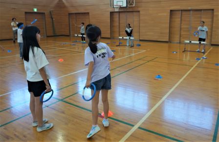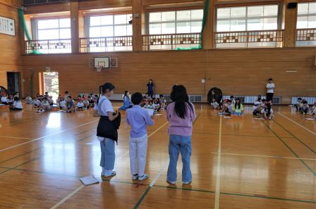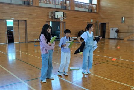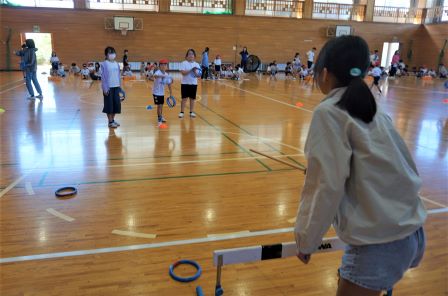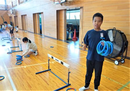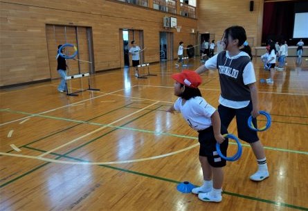 本日の中間休みに、運動会の児童会種目「リングスロー」の、赤組の練習会がありました。児童会本部の指示のもと、素早く縦割り班ごとに整列し、みんなで手順を確認します。