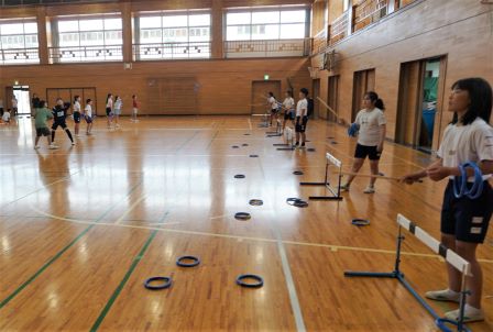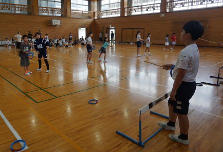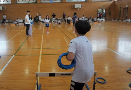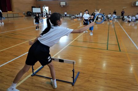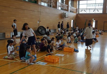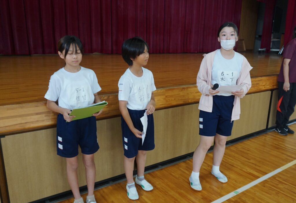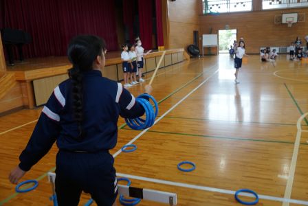 運動会の児童会種目「リングスロー」の練習会、本日は白組の番です。赤組と同様に、高学年がしっかり班をまとめ、児童会本部の司会のもと、スムーズに練習がスタートしました。