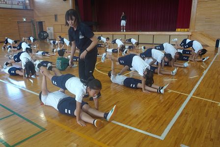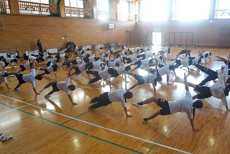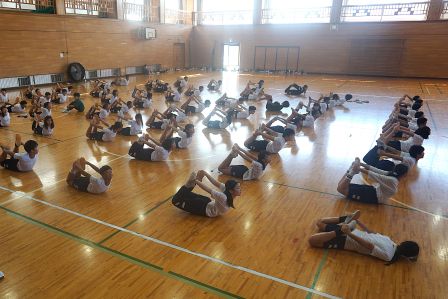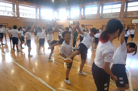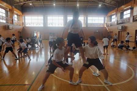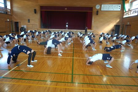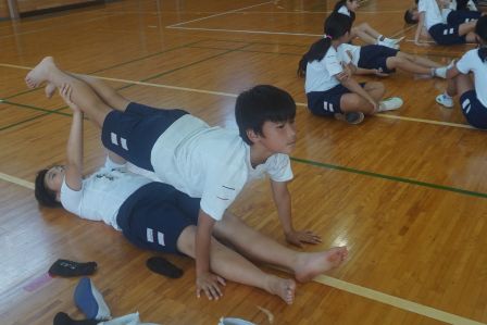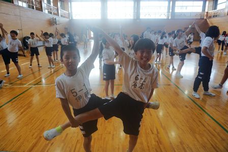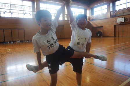 運動会の大トリを飾る、高学年の表現運動。その本格的な練習が始まっています。本日の5時間目に体育館をのぞくと、組体操の技を覚えようと、がんばって練習に取り組む5・6年生の姿が見られました。一人技は、既になかなかの美しさで、音楽に合わせてテンポよく演技が決まっていきます。