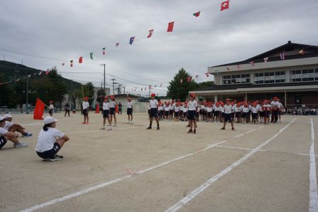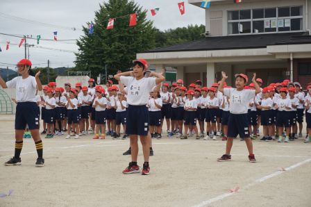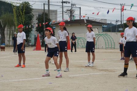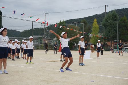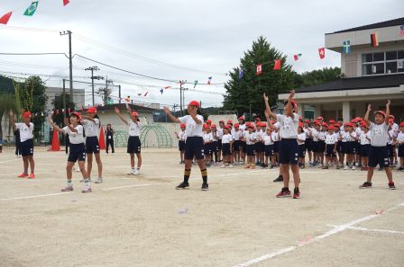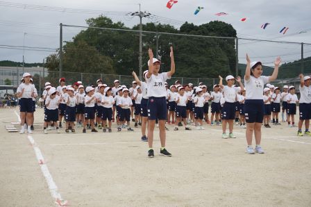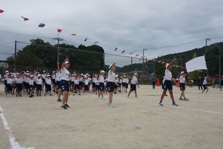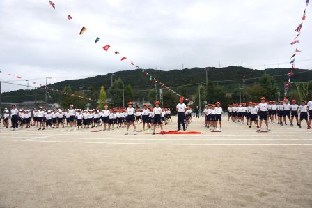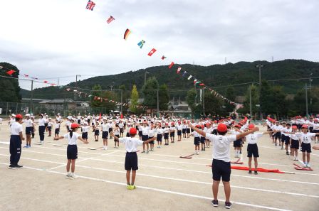 最初のプログラムは準備体操。体育委員の5・6年生たちが前に立ち、しっかりとお手本を示してくれました。これから始まる競技に向けて、全員でしっかり体をほぐしました。