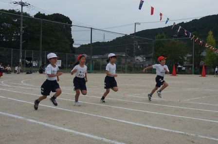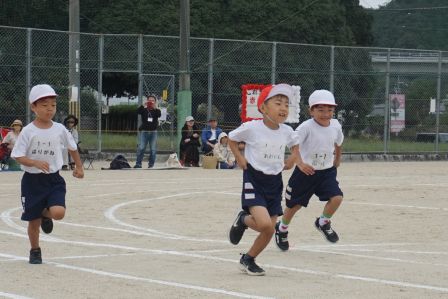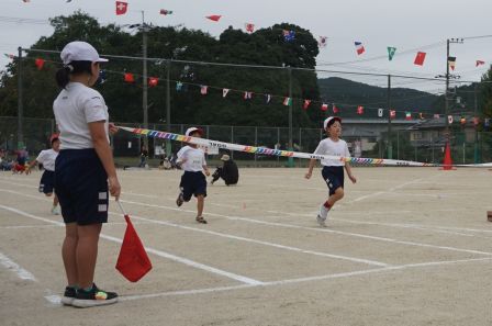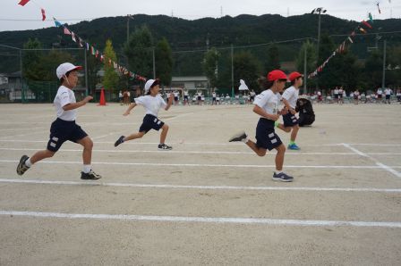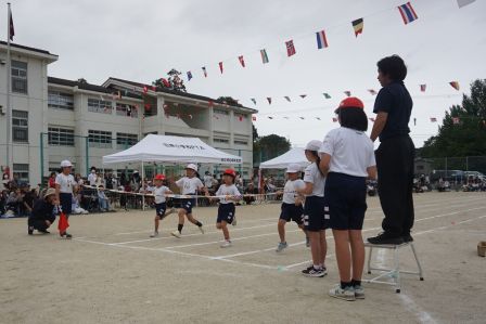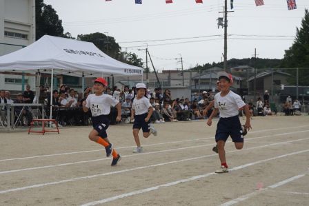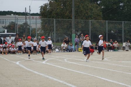 最初の種目は、低学年の徒競走です。1年生は初めての競技でしたが、観客の大きな声援を受けて、みんなしっかりと50mの直線を走り切りました。