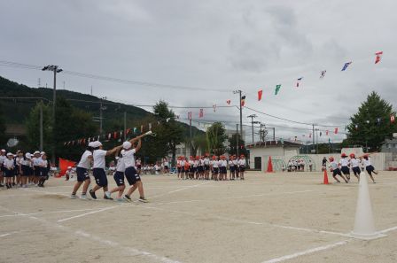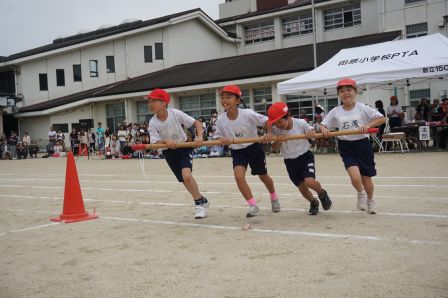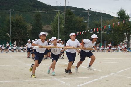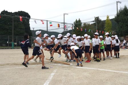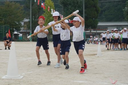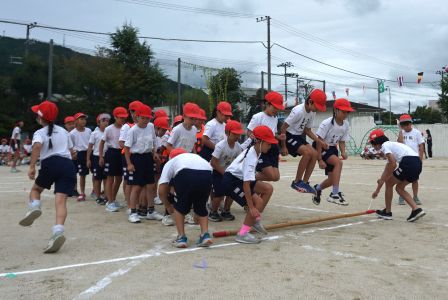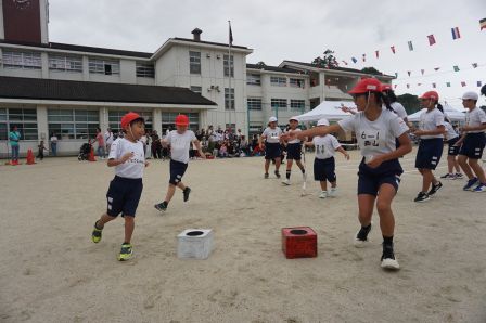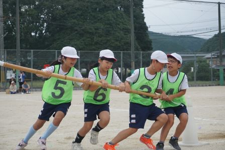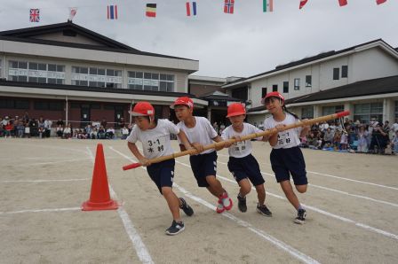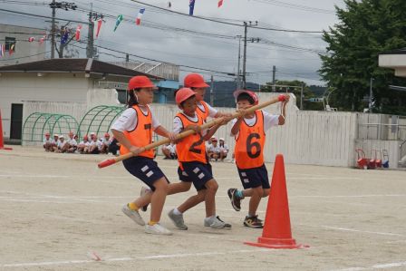 続いては、中学年の団体競技です。誰もが知ってる、運動会では王道の「台風の目」。4人で息を合わせて、竹の棒を運びます。2回のターンは、内側の子が円の中心となって踏ん張り、外側の子がスピードに乗って回転します。どちらの組もがんばりましたが、赤組が最後まで逃げきって勝利しました。