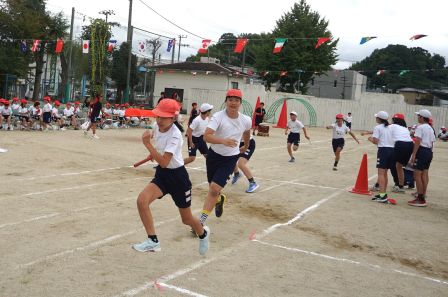 6年生の小学校運動会のラストリレー、赤白各2チーム、全4チームで競います。どのチームも見事なバトンパスで、どこが勝つのか分からない白熱したレース展開でした。最後は、1位と2位、3位と4位がそれぞれ大接戦になりましたが、見事に白組が、1位と3位を勝ち取りました。