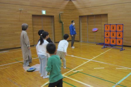 11月の「まなび茶ろん」は、ニュースポーツ。宇治田原町のスポーツ推進委員の皆さんにもご協力いただき、体育館で楽しくスポーツをして汗を流しました。今回用意していただいた種目は「ディスクゲッター9」「輪投げ」「スクエアボッチャ」の3種目です。