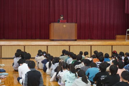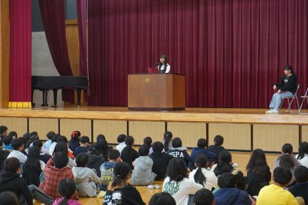 今週の15日(土)、町文化センターで開催される「宇治田原町 小・中学生主張大会」に、本校から6年生児童2名が出場します。今日の「すくすく広場」では、明後日の本番前に校内発表会を開き、全校児童の前で主張作文を披露してもらいました。2名の児童は、運動会明けから毎日、学校や自宅で発表の練習を積んできました。今日は、その成果をしっかりと発揮し、全校の前でも臆することなく、堂々と発表することができました。