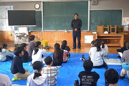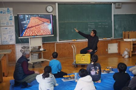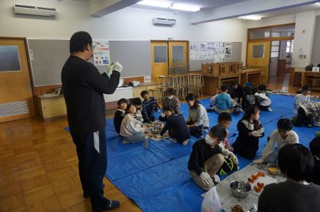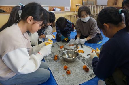 本日の1・2時間目に、3年生が、町の特産品「古老柿」づくりに挑戦しました。子どもたちのためにたくさんの柿をご用意いただき、作り方を教えてくださるのは、地域の柿作り名人・森口雅至さん。森口さんの説明をしっかり聞いてから、みんなで作業に臨みます。