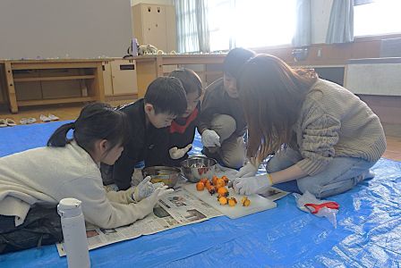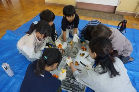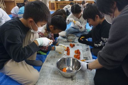 保護者の皆さんにも手伝っていただきながら、ていねいに柿の皮をむいていきます。どの子も真剣な表情で、ピーラーを器用に操ります。500個ほどご用意いただいた柿は、わずか30分ほどで、すべてむき終わりました!